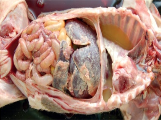 - Phổi: viêm dính, sung huyết, có mủ.